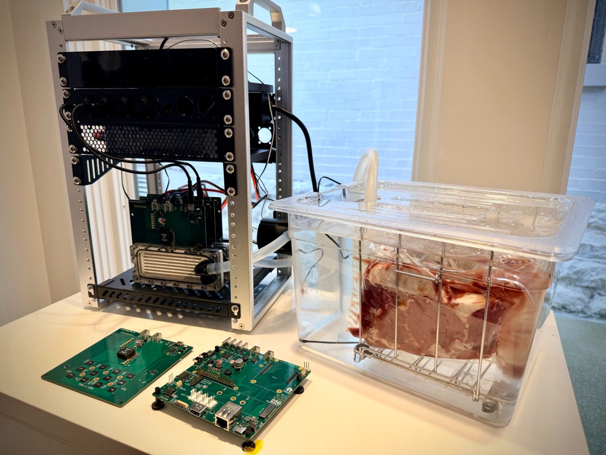 TeleHash #3 was the most significant event yet — the first time all four core pillar projects ran together in a single working system. Ember One hashboards driven by Libre Board, running Mujina firmware, pointed at a self-hosted Hydrapool instance. Lead developers were up until 1am the night before getting everything stable. For the event, the team built a test bench kit using water cooling blocks from CryoByte Labs, converting the mining rig into a sous vide heater. They cooked a steak live on stream, using Mujina firmware to dynamically adjust mining power output and hold a temperature probe at exactly 101°F. The demo made it undeniably real: open-source mining hardware doing useful work in the world.